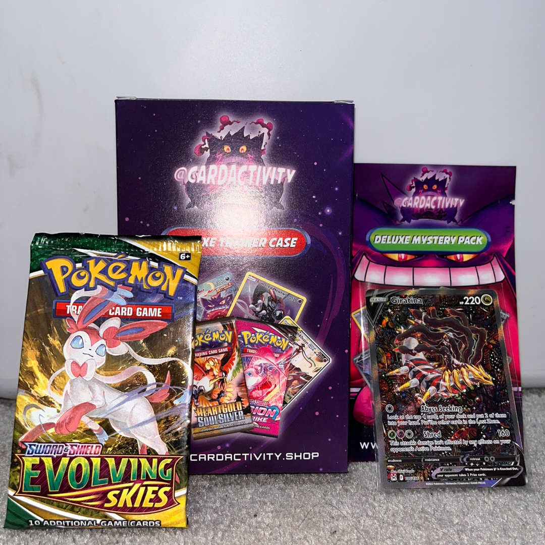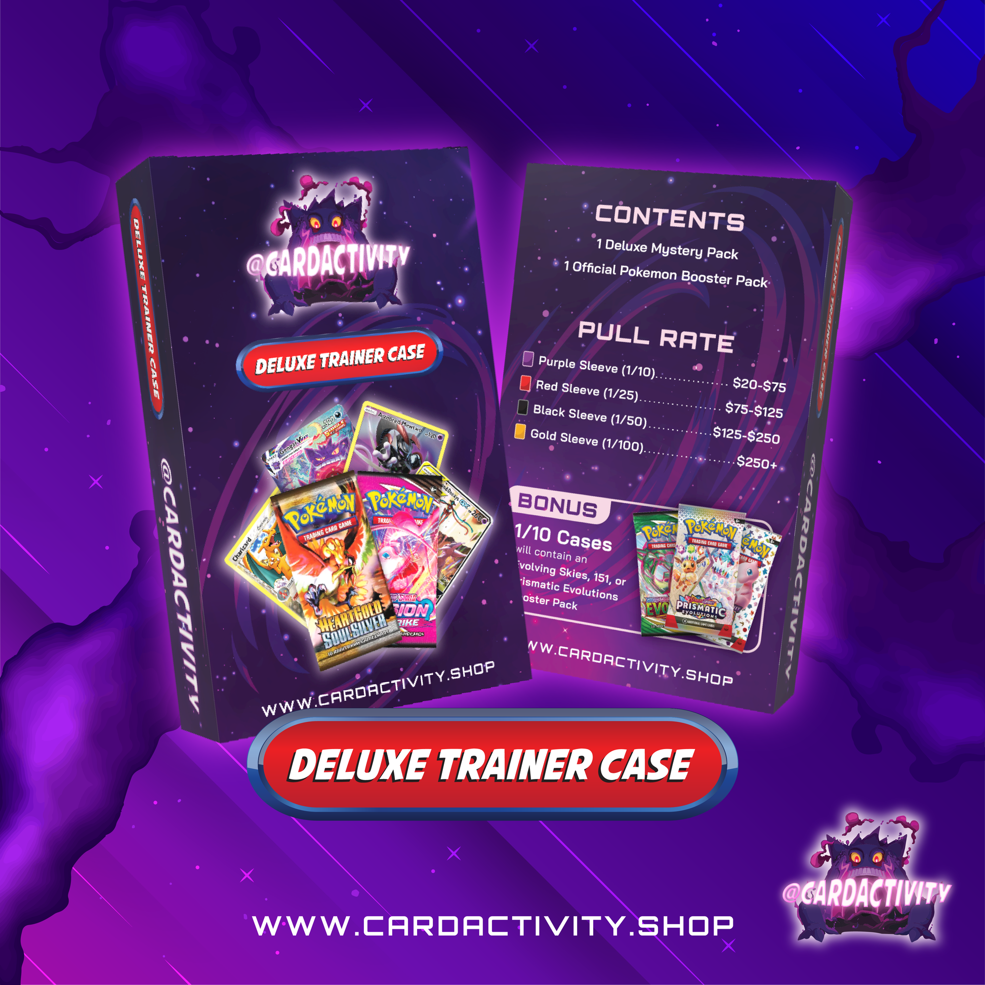 Introducing our 2nd Edition Deluxe Trainer Case! A complete redesign along with updated hit rates and bonuses! This product includes 1 Deluxe Mystery Packs and 1 Official Pokémon Booster Packs. Famous for our bonuses, the box will also have a chance of having a rare Evolving Skies, Prismatic Evolutions, or 151 booster pack! Hesitant or unsure? We have been open for 8 months, and we have over 100+ reviews (over 1000+ orders) now with a 4.6 star rating. For a mystery pack, it doesn't get better then that.